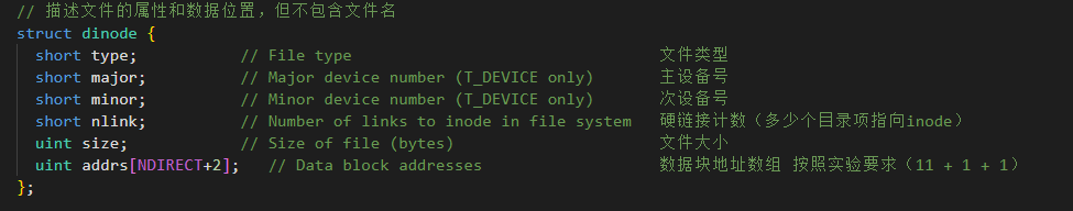 将inode 映射到数据块的关键。addrs 数组大小通常是13(NDIRECT=12, +1 Indirect).