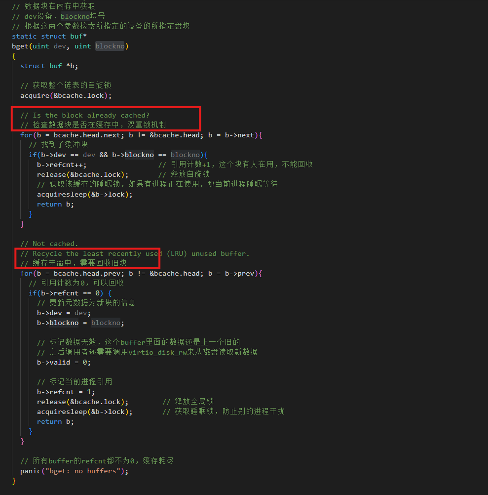 bget()的参数分别是:dev(设备)blockno(块号);根据这两个参数就可以检索到所指定的设备的所指定的盘块。首先会去检查是否有线程的块,如果有直接返回对应的块并把引用计数+1,如果没有则需要通过LRU的方式来分配一个新的块,标注了设备和块号对应的映射关系之后返回这个块,但是此时b->valid=0,等真正需要数据的时候调用 bread 进行读取时装载。