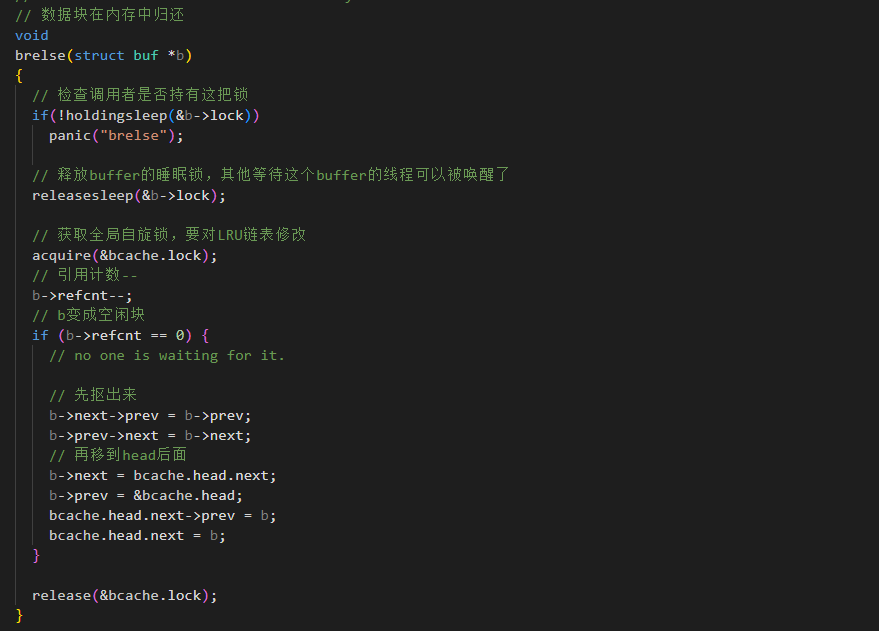 1.brelse(释放):当一个buffer用完释放时,代码会把它移动到链表的头部(bcache.head.next)。这意味着:链表头部是最近刚被用过的(MRU),链表尾部是很久没用的(LRU)。