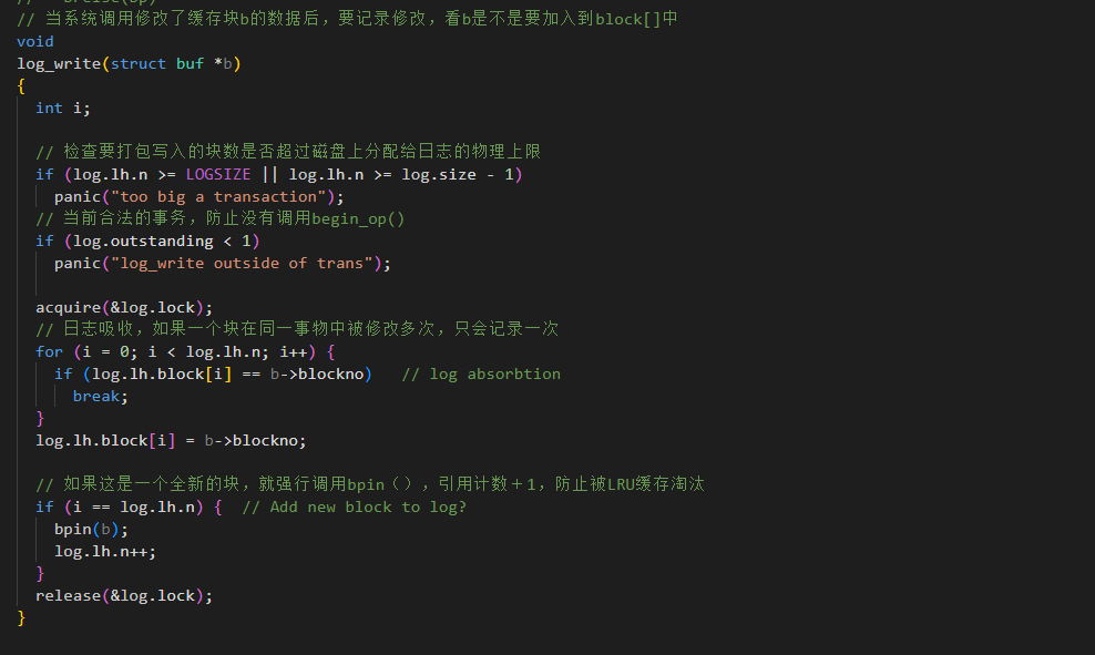 在之前的分层架构图中已经知道 Logging layer 在 Inode layer 之下,在Buffer Cache Layer 之上。日志层的上层不会直接调用 bwrite,而是调用 log_write 先把修改意图告诉日志层,然后日志层调用bwrite 将数据刷入磁盘。