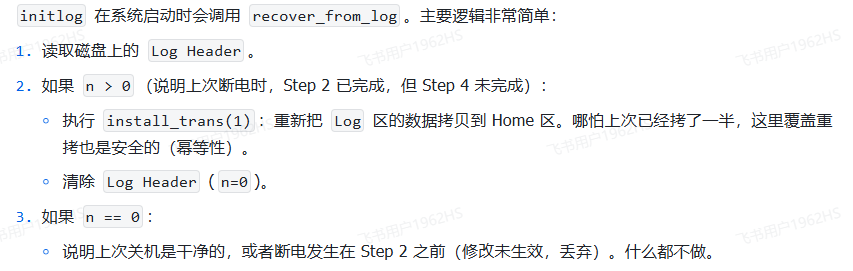 write_head():将磁盘上的 Log Header的计数n清零。表示事务结束,释放Log空间。