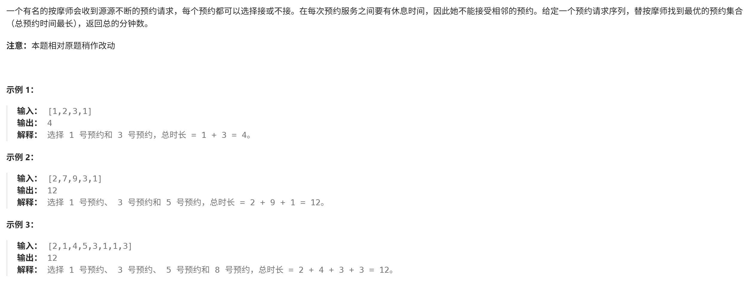 - [1. 按摩师 (面试题17.16)](#1. 按摩师 (面试题17.16))