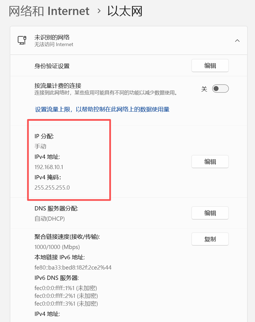 1.连接设备,设置以太网静态IP