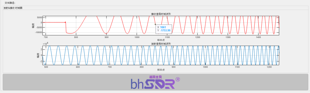 - **接收信号时域波形:**上方红色波形,是经过目标反射后的回波信号,与发射信号存在固定的时延差;