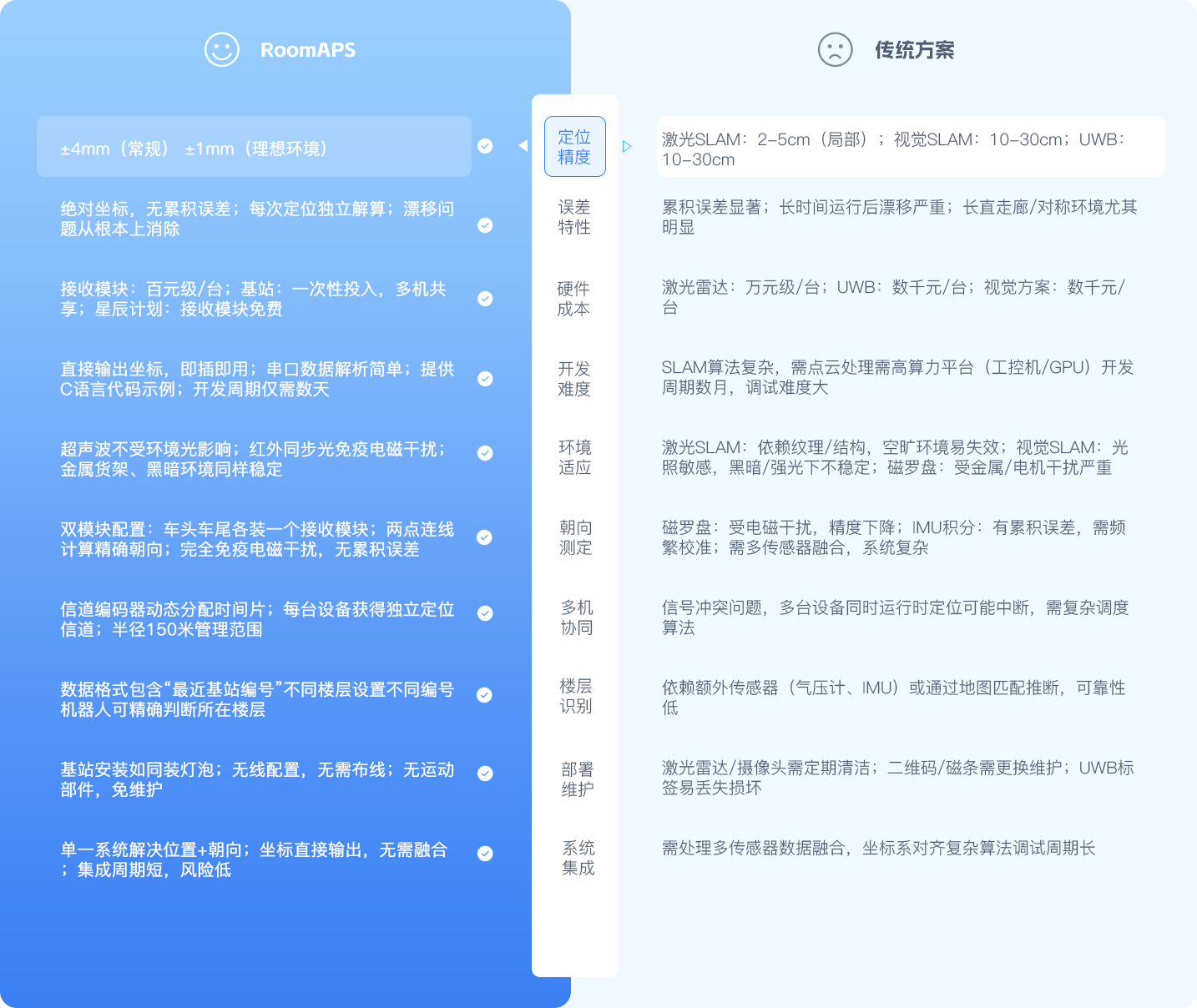 RoomAPS正是这样一套系统。它通过部署于天花板的定位基站网络,为机器人提供毫米级绝对坐标------每次定位独立解算,误差稳定控制在±4毫米以内(理想环境下可达±1毫米),且没有累积漂移。