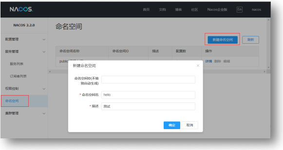 新建一个命名空间 hello,其会自动生成该命名空间的 ID。