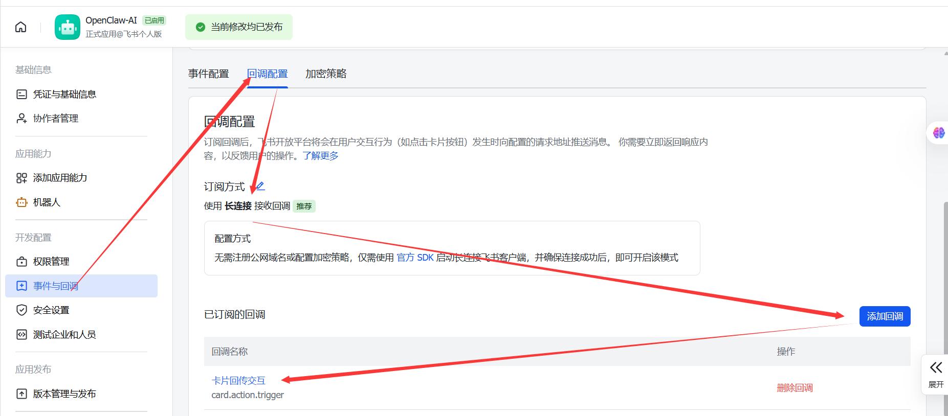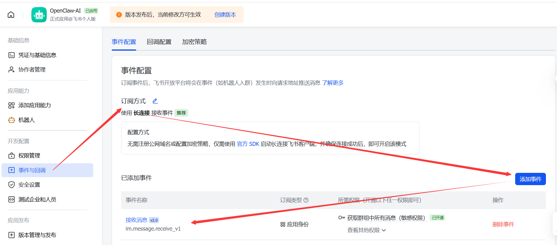 进入你的飞书应用 → 开发配置 → 事件与回调