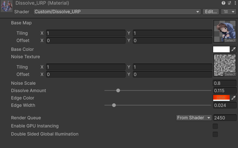 _DissolveAmount(0~1)控制溶解程度,可用脚本/动画驱动 - 边缘宽度可调 :