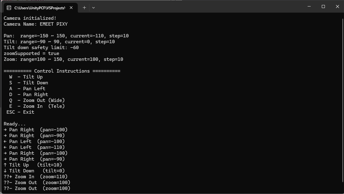 std::cout << "Pan: range=" << cam.minPan << " ~ " << cam.maxPan << ", current=" << cam.currPan << ", step=" << PAN_STEP << std::endl;