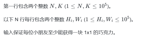 # 要求:N块切出K块正方形大小相同的巧克力(当分出的巧克力块数大于等于小朋友人数满女足条件)