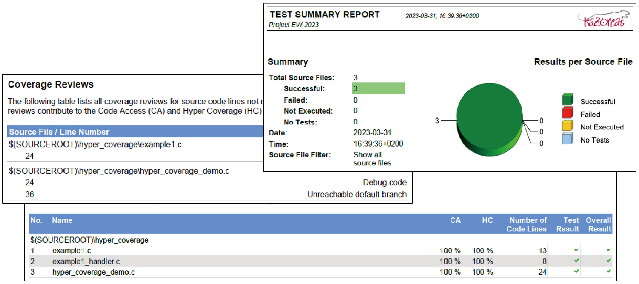 经过评审的代码⾏被纳⼊代码访问(CA) 和超级覆盖率(HC)的统计中,使用户可通过标准覆盖率测量结合覆盖率评审,始终达成完整覆盖率。所有覆盖率评审记录均将纳入测试汇总报告。