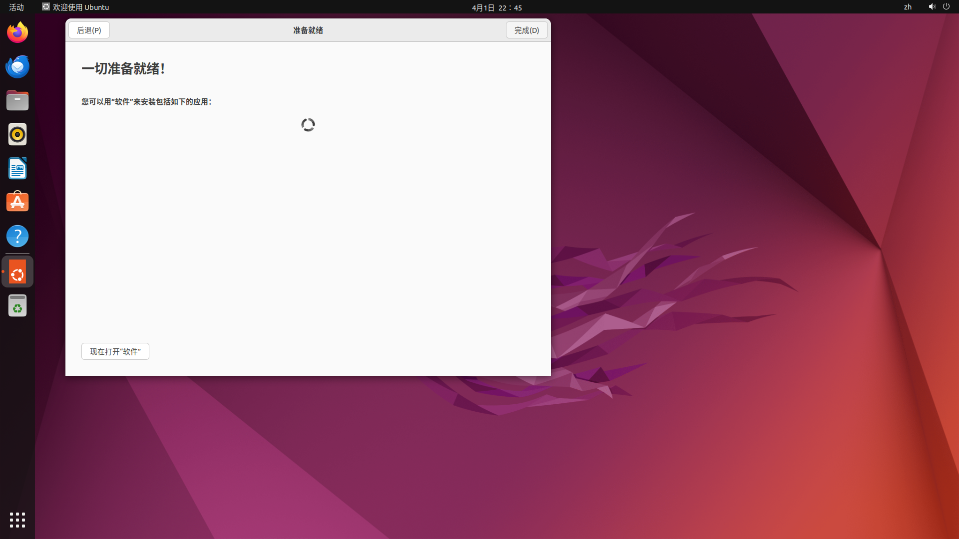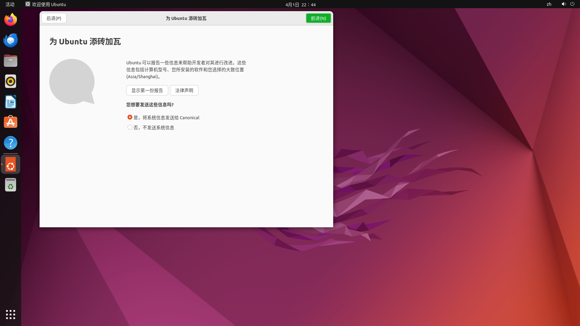 首次启动后会弹出设置向导,由于我们没有设置网络,简单设置一下就可以。是否加入Ubuntu Pro,这个没网加不了,选择默认的跳过,然后点右上角"前进"按钮: