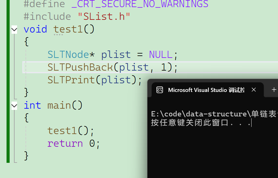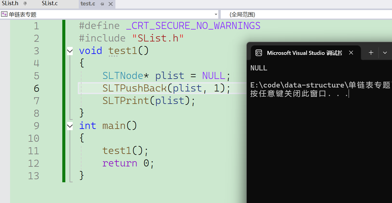 我们发现这次程序成功输出了,但却只输出了NULL,并没有输出我们预想的1->NULL,这又是为什么呢?别急,我们调试一下