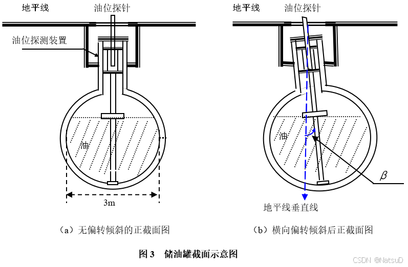 许多储油罐在使用一段时间后,由于地基变形等原因,使罐体的位置会发生纵向倾斜和横向偏转等变化(以下称为变位),从而导致罐容表发生改变。按照有关规定,需要定期对罐容表进行重新标定。图1是一种典型的储油罐尺寸及形状示意图,其主体为圆柱体,两端为球冠体。图2是其罐体纵向倾斜变位的示意图,图3是罐体横向偏转变位的截面示意图。