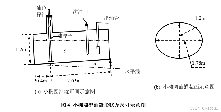 (1)为了掌握罐体变位后对罐容表的影响,利用如图4的小椭圆型储油罐(两端平头的椭圆柱体),分别对罐体无变位和倾斜角为a =4.10的纵向变位两种情况做了实验,实验数据如附件1所示。请建立数学模型研究罐体变位后对罐容表的影响,并给出罐体变位后油位高度间隔为1cm的罐容表标定值。