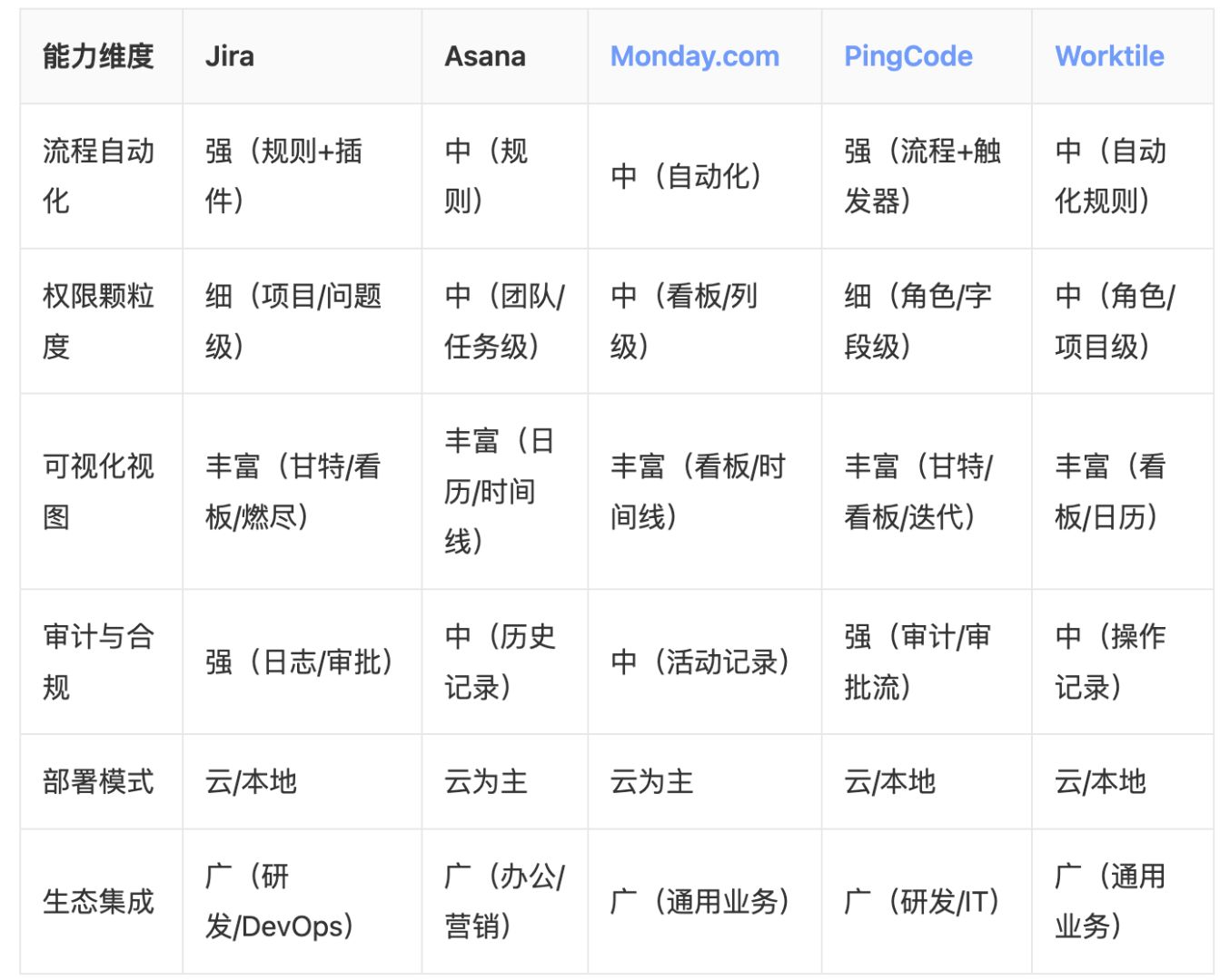 跨部门项目管理平台的选型应围绕流程可配置性、自动化能力、权限治理、可视化深度与生态集成。在国外产品方面,常见选择包括Jira(Atlassian)、Asana与Monday.com;在国内,PingCode与Worktile具备较好的流程与权限配置能力。不同产品在部署模式、生态与合规支持上有差异,需结合组织规模、行业属性与数据主权要求进行评估。