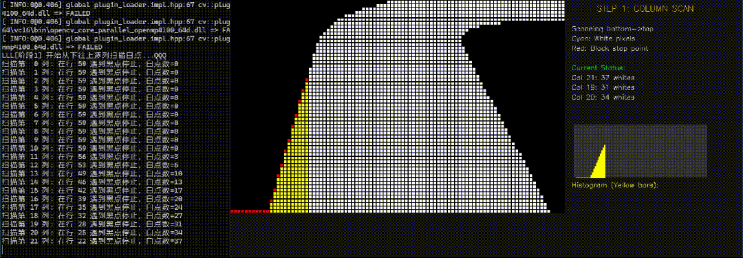 优化后实测效果(核心数据):优化后最长白列搜线法的总像素访问量仅为 3503 次,相较于未优化版本的全列扫描,节省了 76%的计算量,计算耗时大幅降低,冗余计算问题得到有效解决,同时完全不影响边界识别精度,兼顾了新手易用性和调试效率。