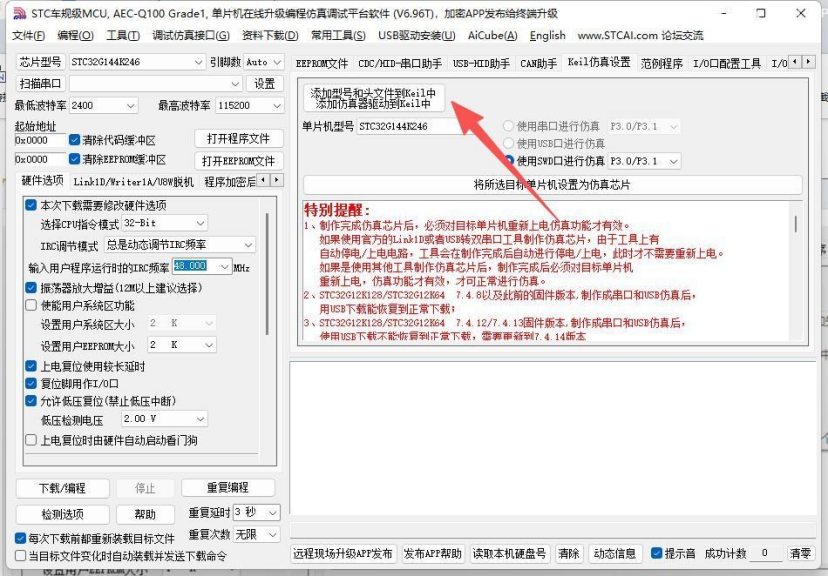(1)首先打开 AiCube - ISP 烧录软件,然后在软件右边功能区的 "Keil 仿真设置" 页面 中,先选择对应的单片机型号(此处以 STC32G144 为例),然后点击 "添加型号和头文件到 Keil 中 添加仿真器驱动到 Keil 中" 按钮: