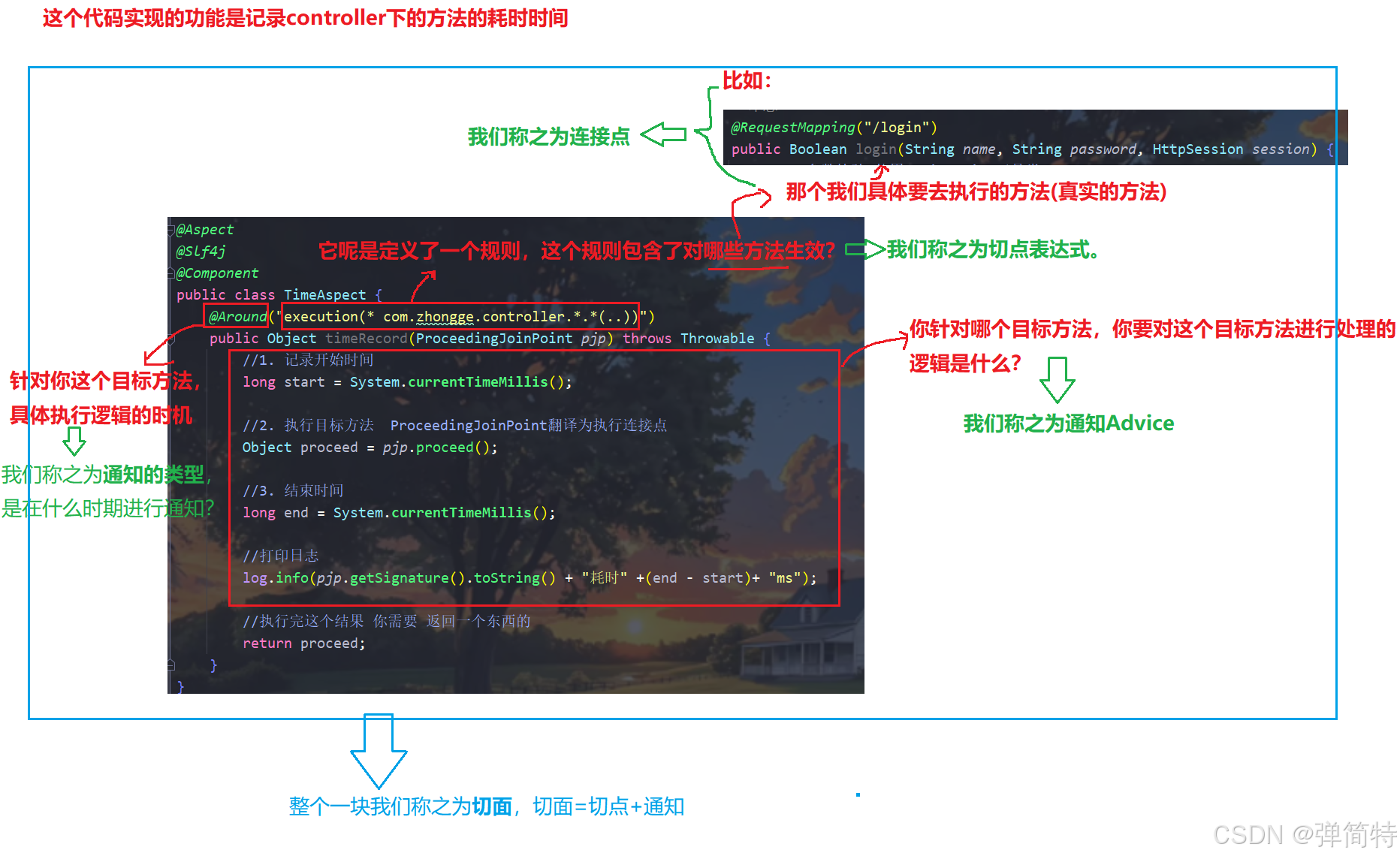 生活例子 :你制定了一条规则:"在校长办公室的门上(切点),贴一张'欢迎光临'的贴纸(通知)"。这条完整的规则就是切面。