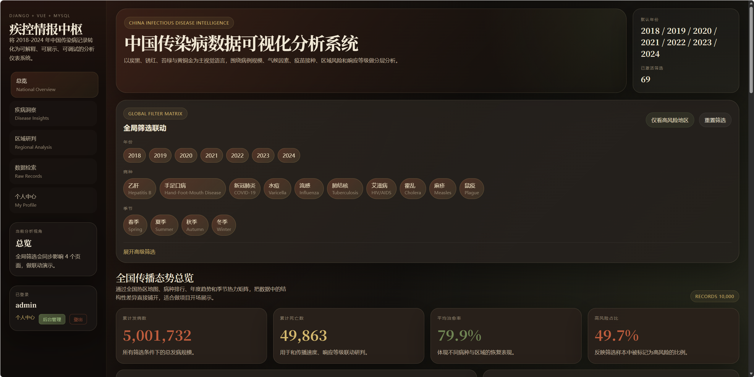 中国传染病数据可视化分析系统是一个用于展示和分析2018-2024年中国各省份传染病数据的综合性平台。系统通过现代化的前端技术和强大的后端分析能力,为疾控中心、研究人员和公众提供直观的数据洞察。