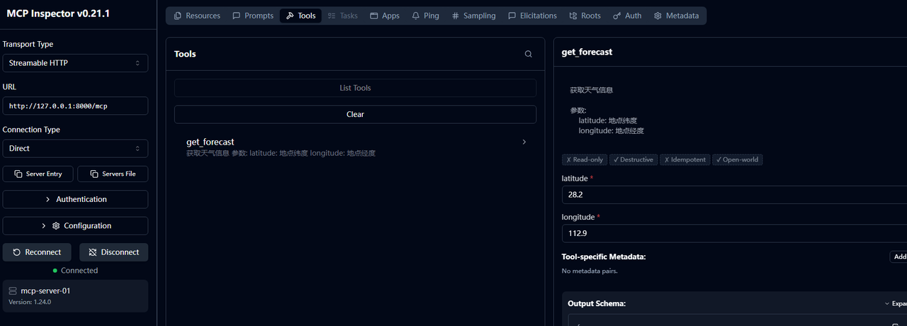 Transport Type选择Streamable HttpURL写入Http://127.0.0.1:8000/mcpConnection Type选择Direct- 点击
