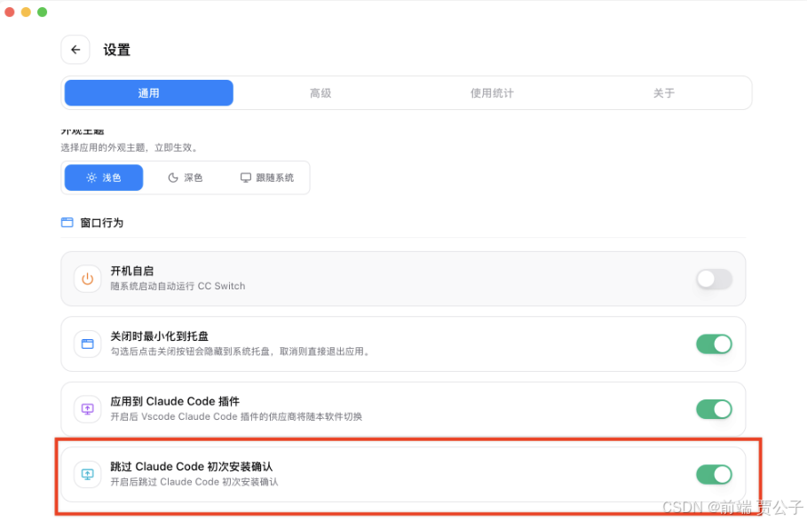 - 启用"跳过 Claude Code 首次运行确认"开关