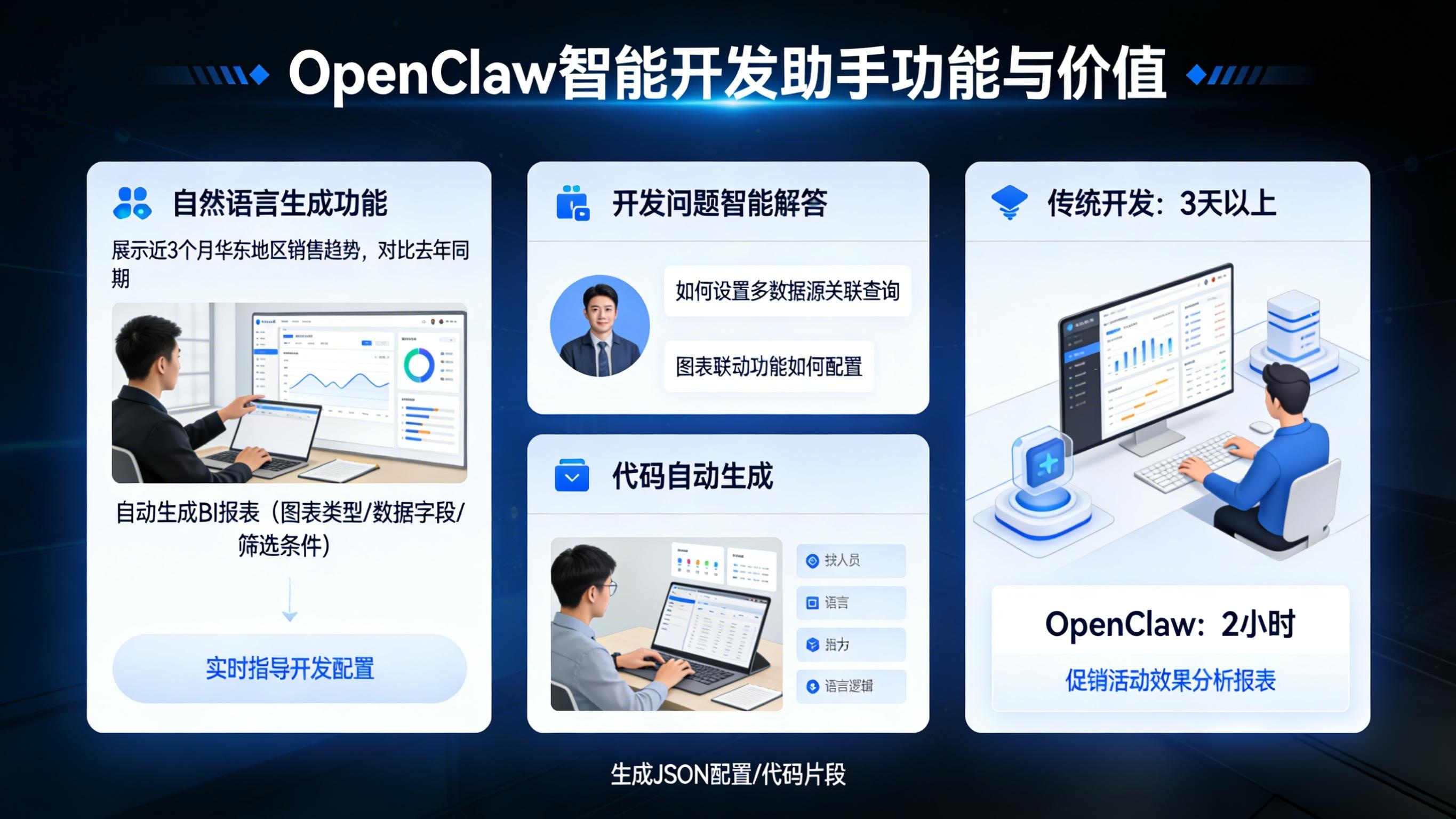 - 能力赋能:通过OpenClaw智能助手降低使用门槛,开展1-2天的实操培训,重点讲解"自然语言生成报表""多数据源关联"等高频场景