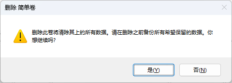 由于有些U盘此前做过启动盘,含有UEFI分区,我们在这里需要先删除U盘的全部分区。备份好U盘的重要资料后,右键点选要删除的分区,选择"删除卷"选项,在弹出的窗口中选择"是"来删除分区。