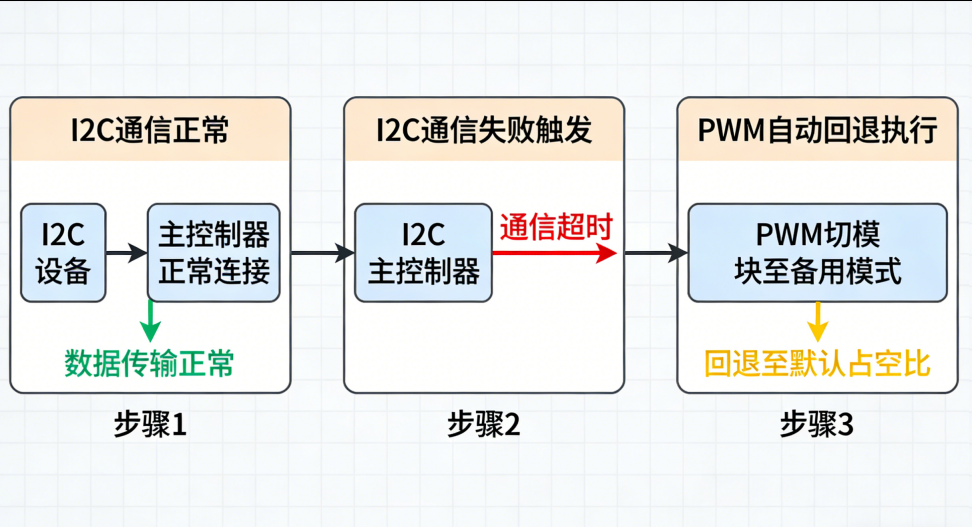 | plain text [1] 模拟主控发起I2C读取 [2] 通过UTP强制I2C返回NACK(模拟传感器故障) [3] 验证主控是否通过UART上报故障 [4] 验证PWM是否回退到安全占空比(如10%) [5] 验证GPIO是否触发报警指示灯 |