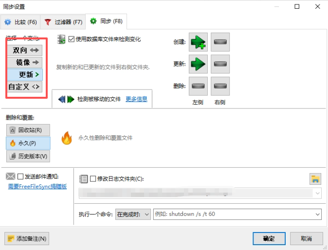 镜像同步(适合单向备份):将源文件夹完全同步到目标文件夹,目标文件夹会和源文件夹完全一致,源文件夹删除文件,目标文件夹也会删除对应文件;目标文件夹新增的文件,会被删除(慎用!确保目标文件夹无独有重要文件)。
