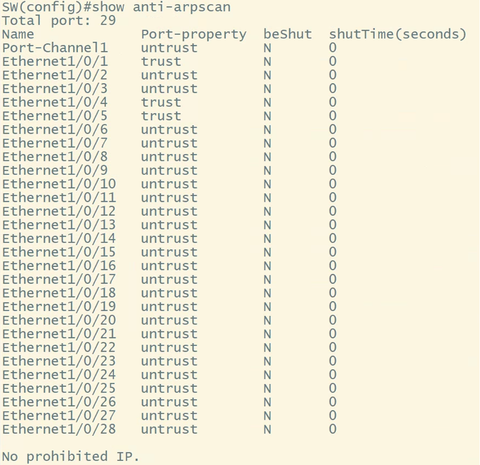 ARP 扫描是一种常见的网络攻击方式,攻击源将会产生大量的 ARP 报文在网段内广播,这些广播报文极大的消耗了网络的带宽资源,为了防止该攻击对网络造成影响,需要在总公司交换机上开启防扫描功能,对每端口设置阈值为40,超过将关闭该端口20分钟后自动恢复,每IP阈值设置为30,与防火墙相连的接口及分公司互联接口不检查。