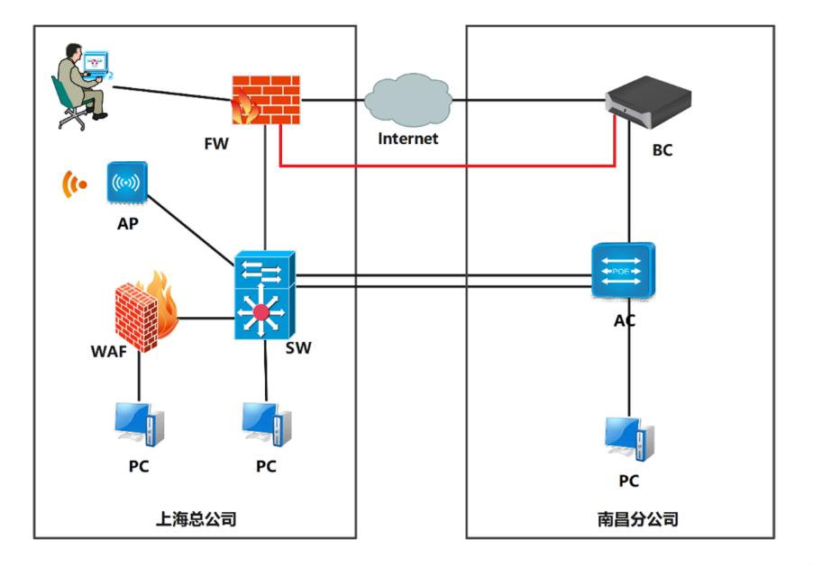 某集团公司在上海建立了总部,在南昌设立了分公司。总部设有行政、销售、财务、管理4个部门,分公司设有行政、财务、销售、办公4个部门,统一进行IP及业务资源的规划和分配,IPv4全网采用OSPF动态路由协议进行互连互通。公司规模在2025年快速发展,业务数据量和公司访问量增长巨大。为了更好管理数据,提供服务,集团决定建立自己的中型数据中心及业务服务平台,以达到快速、可靠交换数据,以及增强业务部署弹性的目的。总部、分公司的网络结构详见拓扑图。其中总公司使用一台SW交换机用于总部核心和终端高速接入,采用一台FW作为总公司因特网出口;分公司采用一台BC防火墙作为因特网出口设备,一台AC作为分公司核心,同时作为集团有线无线智能一体化控制器,通过与高性能企业级AP配合实现集团无线覆盖,总部有一台Web服务器,为了安全考虑总公司部署了一台WAF对服务器进行Web防护。在2026年公司为响应国家政策进行IPv6网络改造试点,实现总公司和分公司双栈网络通信。