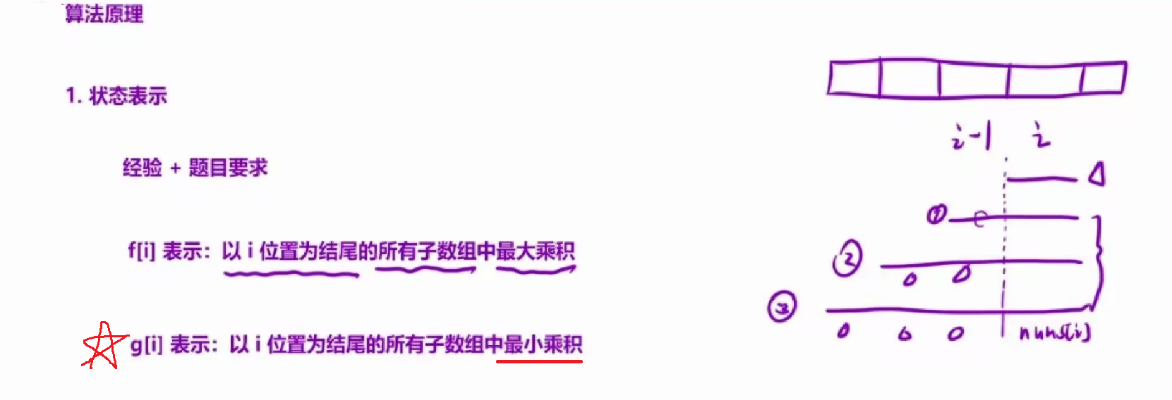 对于g[i],也就是「以i为结尾的所有子数组的最小乘积」,对于所有子数组,可以分为下面三种形式: