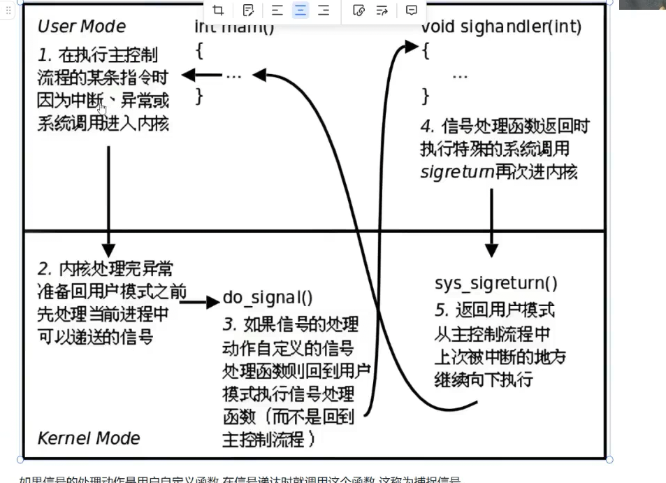 捕捉信号:硬件中断信号产生->执行中断处理方法,修改当前进程taststruct pending表,中断处理完,进程继续运行,发生陷阱,异常中断,导致陷入内核,返回时检查。