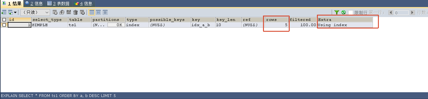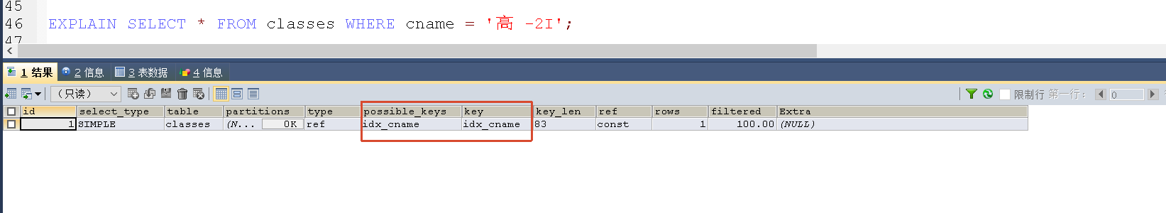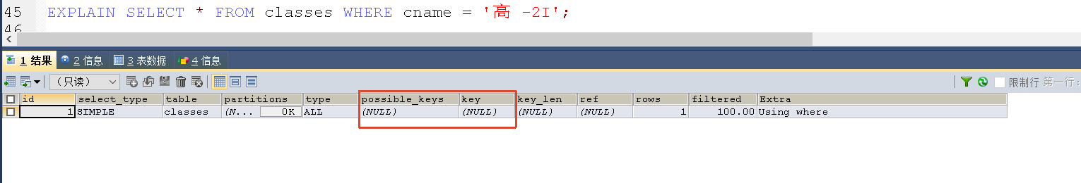 关注两个字段:possible_keys行给出了MySQL在搜索数据记录时可选用的各个索引。key行是MySQL实际选用的索引。