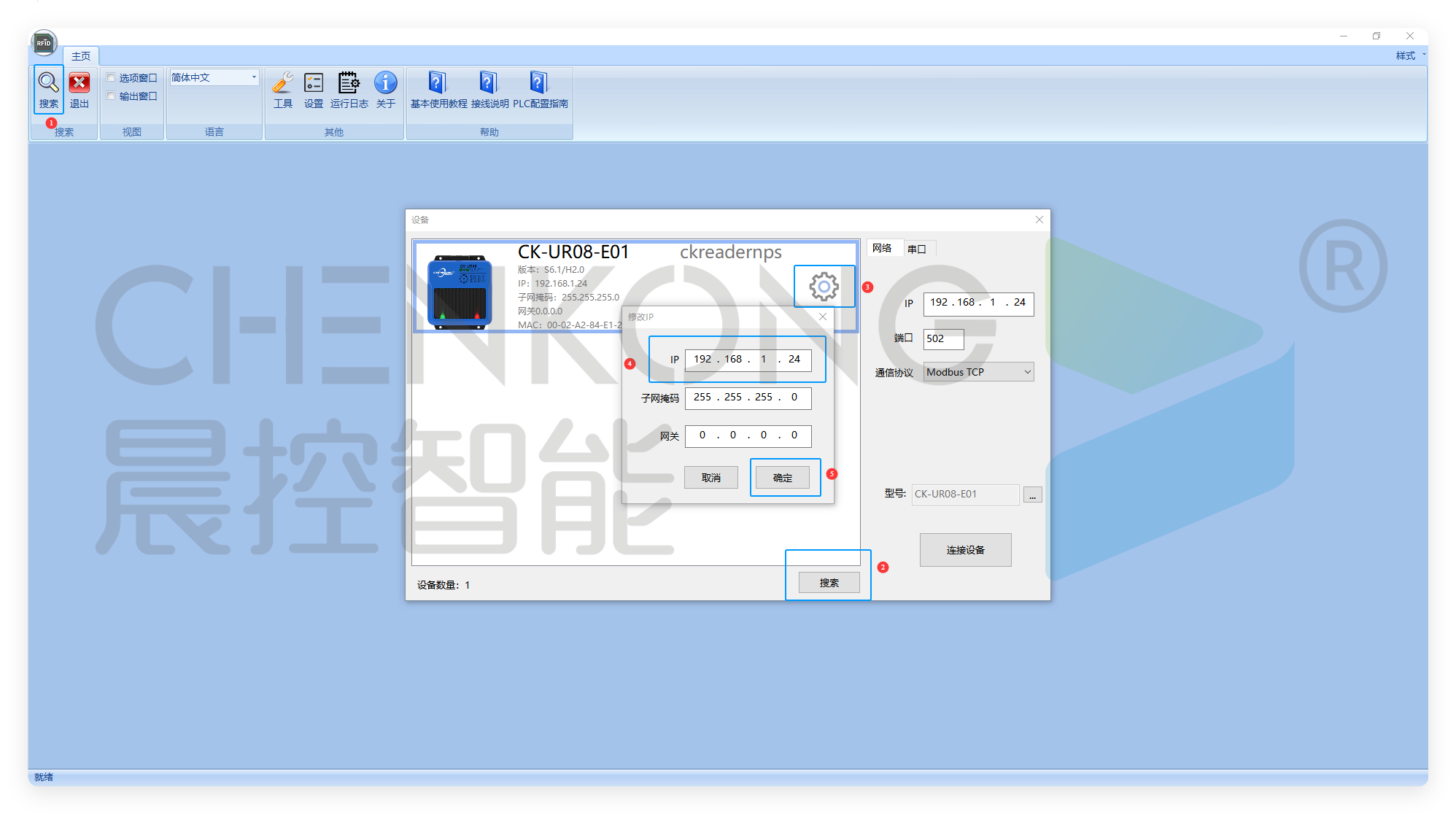 搜索出设备后,点击齿轮,填写修改IP,确定保存