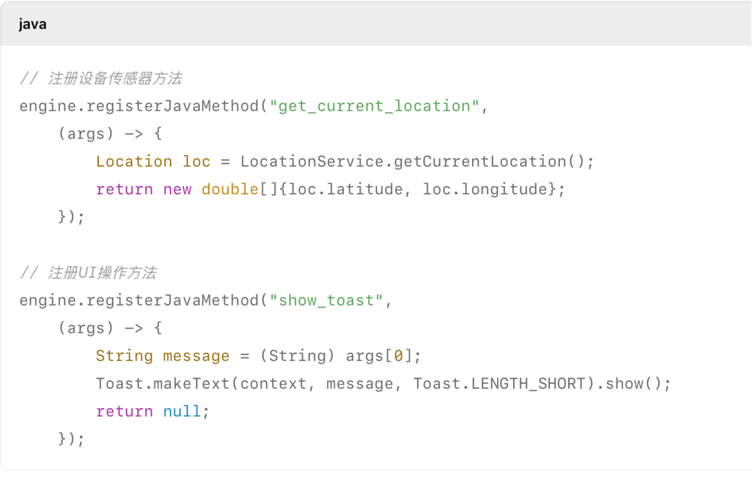 • 定义:将Java层(或其他Native层)实现的功能方法,注册到Python解释器中,让Python脚本可以像调用本地函数一样调用这些外部方法。