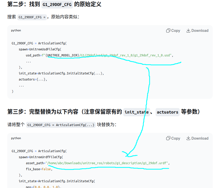 找到 UNITREE_G1_29DOF_CFG = UnitreeArticulationCfg( 这一行,一直选中到对应的结束括号