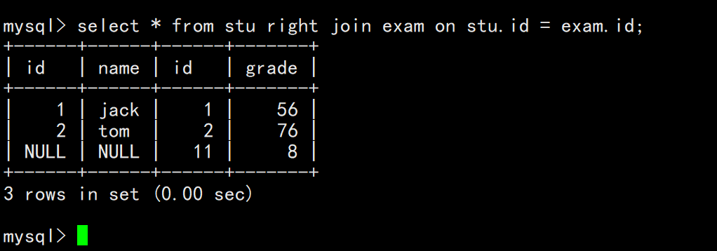 RIGHT JOIN exam ON stu.id = exam.id;