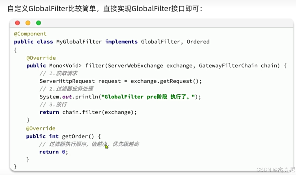 NettyRoutingFilter的过滤器来执行的,而且这个过滤器是整个过滤器链中顺序最靠后的一个。如果我们能够定义一个过滤器,在其中实现登录校验逻辑,并且将过滤器执行顺序定义到NettyRoutingFilter之前,这就符合我们的需求了!