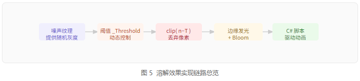 通过噪声纹理 提供天然的不规则性、 clip 函数 实现无中间灰度的硬截断、 边缘宽度 构造发光带、 C# 协程 驱动 _Threshold 随时间变化------ 四个模块各司其职,任何一个都可以单独替换和扩展, 比如把噪声换成 SDF 字体,就能得到文字侵蚀效果; 把方向性溶解与粒子系统结合,就是经典的死亡灰烬特效。