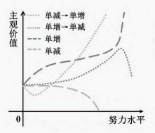 努力本身具有价值,个体对努力的评价受到个体对努力投入的主观偏好的综合影响,即更看重努力产生的代价(负性评价)还是更看重努力带来的奖励(正性评价)。DPOWER模型构建了关于努力投入与努力结果的主观价值的函数关系。具体来说,当个体对努力投入呈正性评价时,主观价值随努力投入的增加而增加;当个体对努力投入呈负性评价时,主观价值随努力投入的增加而降低。由于个体对努力结果的偏好可能会因努力需求而改变,如若个体最初对努力呈负性评价,当努力值达到一定水平后,随着努力投入的持续增加,他们对努力的偏好逐渐由代价变为奖励,评价随之由负性转为正性,价值函数相应地由单减转为单增;反之,若个体最初对努力呈正性评价,当努力值达到阈限后,随着努力投入的持续增加,他们对努力的偏好逐渐由奖励变为代价,评价随之由正性转为负性,价值函数由单增转为单减(Marcowski,Winkielman和Białaszek,2023),如图3。