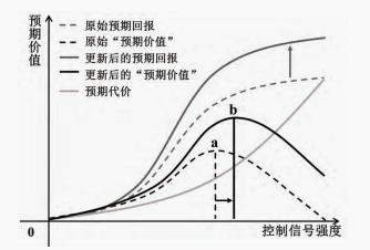 根据EVC模型,若认知代价固定不变,上述外在奖励提升时,奖励曲线也随之上升,从而影响预期价值(如图2),随着外在奖励的增加,奖励曲线上移(奖励:深灰色虚线→深灰色实线;预期价值:黑色虚线→黑色实线;EVC值:a→b),进而促进认知控制和行为表现。