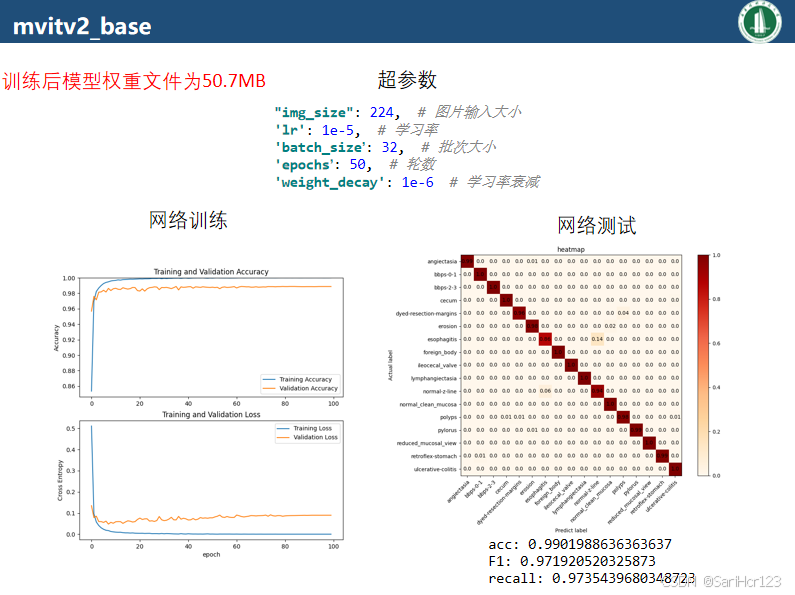 我的效果图依然按照之前的那样展示,中间上方的是超参数的设置,左边是网络训练的过程,右边是网络测试生成的热力值图,右下方显示的是acc,F1,recall。分别是准确率,F1分数,召回率。左上方显示的是训练后模型权重文件的大小。下面将展示各模型的训练测试效果,有较大模型到较小的模型依次展示。