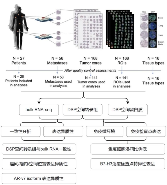 本研究利用DSP技术对转移性前列腺癌不同空间区域的转录本与蛋白质丰度进行了定量分析。通过对多个转移灶中不同区域进行评估,发现在肿瘤表型层面存在较高水平的患者间同质性,但也观察到明显的例外情况,例如部分肿瘤由雄激素受体活性高低不一或伴有神经内分泌活性的区域共同构成。在所检测的绝大多数转移灶中,未见显著的炎症浸润,亦缺乏PD1、PD-L1及CTLA4等免疫检查点分子的表达;然而B7-H3/CD276免疫检查点蛋白呈现高表达,尤其在雄激素受体活性较高的转移性前列腺癌中更为明显。上述结果证实了DSP技术在肿瘤表型精准分类、肿瘤异质性评估以及识别免疫相关肿瘤生物学特征方面的应用价值。
