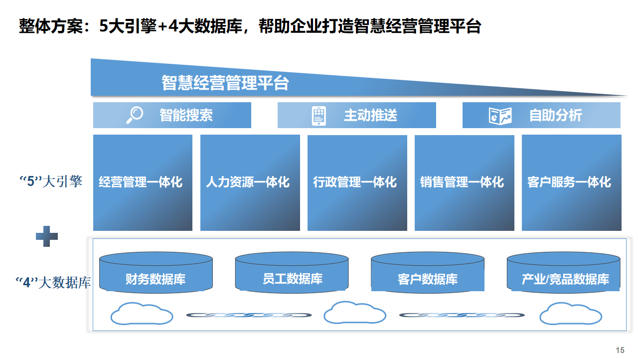 - 5大引擎: 智能搜索、主动推送、自助分析、经营管理一体化、人力资源一体化。