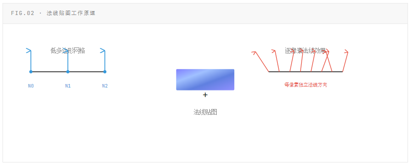 单纯将光照计算移到片元着色器只是逐像素光照的第一步。配合**法线贴图(Normal Map)**后,每个像素可以拥有与几何体网格完全不同的法线方向,从而在低多边形模型上模拟出高多边形的表面细节。这是逐顶点光照在结构上无法实现的能力。