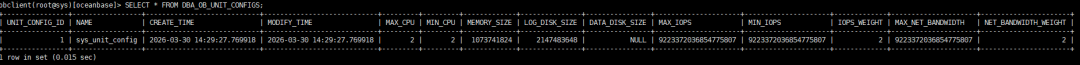 obclient(root@sys)[oceanbase]> SELECT * FROM DBA_OB_UNIT_CONFIGS;+----------------+-----------------+----------------------------+----------------------------+---------+---------+-------------+---------------+----------------+---------------------+---------------------+-------------+---------------------+----------------------+| UNIT_CONFIG_ID | NAME | CREATE_TIME | MODIFY_TIME | MAX_CPU | MIN_CPU | MEMORY_SIZE | LOG_DISK_SIZE | DATA_DISK_SIZE | MAX_IOPS | MIN_IOPS | IOPS_WEIGHT | MAX_NET_BANDWIDTH | NET_BANDWIDTH_WEIGHT |+----------------+-----------------+----------------------------+----------------------------+---------+---------+-------------+---------------+----------------+---------------------+---------------------+-------------+---------------------+----------------------+| 1| sys_unit_config |2026-03-3014:29:27.769918|2026-03-3014:29:27.769918| 2| 2|1073741824| 2147483648| NULL|9223372036854775807|9223372036854775807| 2|9223372036854775807| 2 |+----------------+-----------------+----------------------------+----------------------------+---------+---------+-------------+---------------+----------------+---------------------+---------------------+-------------+---------------------+----------------------+1 row in set (0.015 sec)