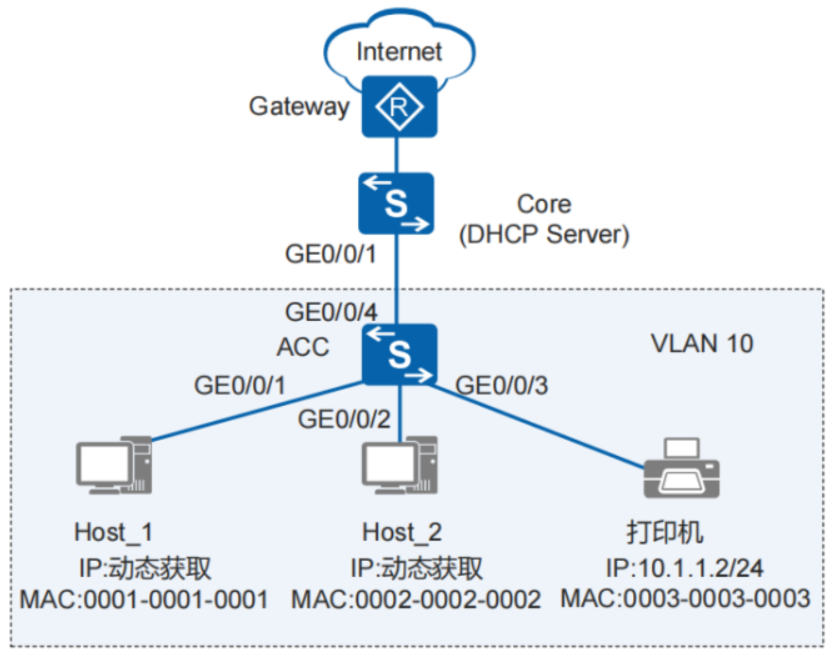 某企业内网,终端主机(Host)通过接入交换机(ACC)接入内网,核心交换机(Core)作为 DHCP 服务器为终端动态分配 IP 地址,网络打印机采用静态 IP 地址配置,出口网关(Gateway)负责企业内外网互通。为规范内网地址管理,管理员要求终端主机禁止私自配置静态 IP 地址,若用户擅自设置静态 IP,将无法正常访问网络及外部互联网,仅允许通过 DHCP 自动获取地址方可联网。