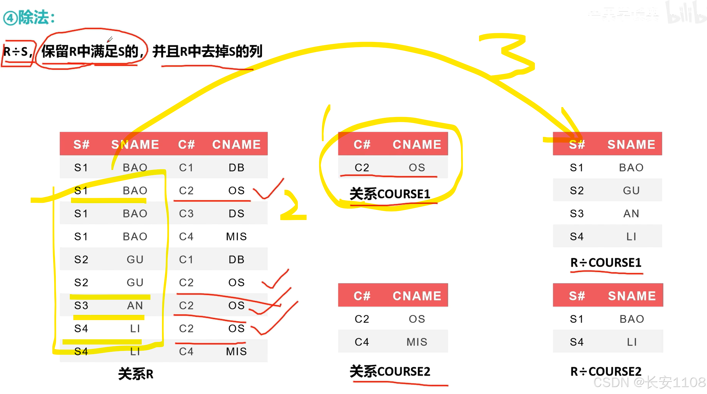 如,R除以COURSE1,首先在R中找到满足COURSE1的记录,然后去掉这些记录的字段,组成新表
